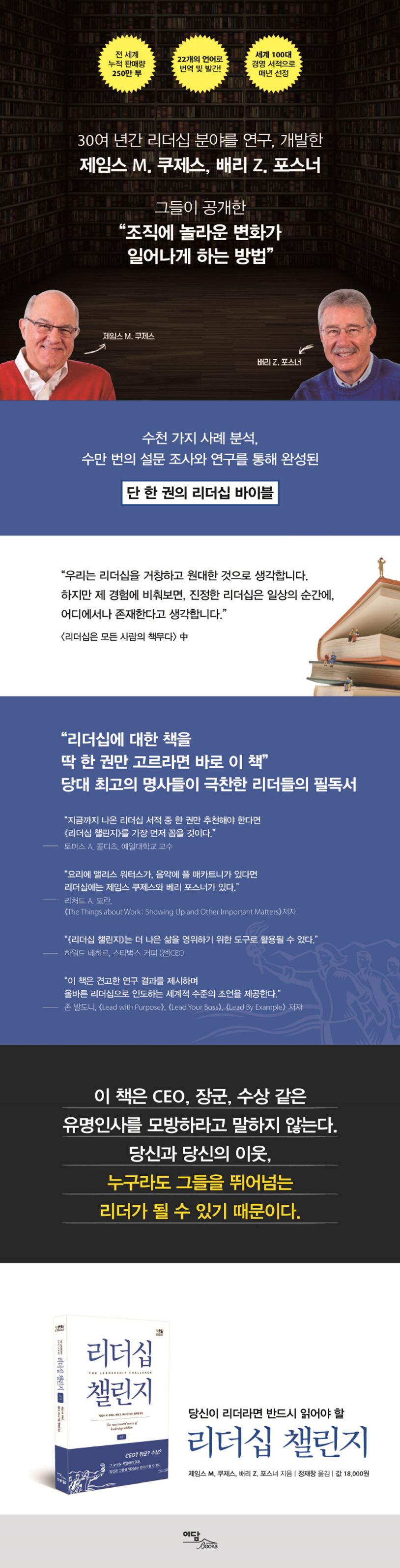 저자가 《리더십 챌린지》를 통해 전달하려는 메시지는 명확하다. “좋은 리더는 엄청난 긍정적 변화를 일으킬 수 있다.” 우리는 모두 잠재적 리더이므로 이 책을 읽으며 리더십을 학습해보자. 삶과 가정, 조직, 지역 사회, 국가에 이르기까지 놀라운 변화가 일어날지도 모른다.