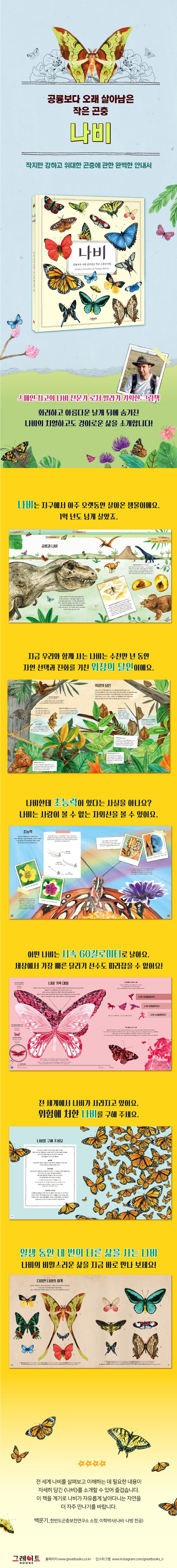 나비의 종류부터 생김새, 능력, 탄생 과정까지 우리가 미처 알지 못했던 나비의 모든 것을 다룬 그림책이에요. 나비가 어떻게 인간보다 많은 색을 볼 수 있는지, 나침반처럼 북쪽을 찾아낼 수 있는지, 1킬로미터나 떨어진 곳에서 나는 냄새를 맡을 수 있는지, 감쪽같이 사라지거나 다른 모습으로 위장하는지 비밀스러운 나비의 삶을 면밀히 알려 줘요. 나비는 단지 아름답기만 한 곤충이 아니에요. 공룡보다 오래 살아남은 아주 강인하고 놀라운 곤충이지요.