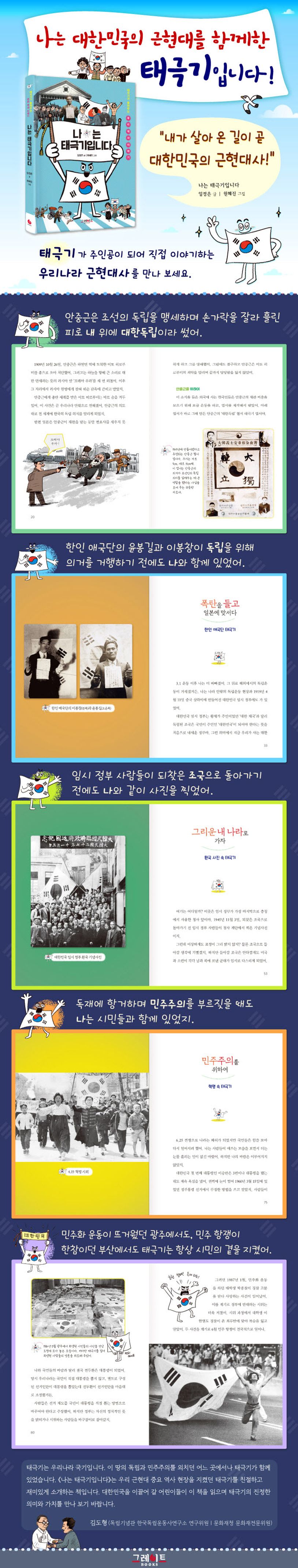 《나는 태극기입니다》는 우리나라 근현대의 중요한 순간마다 우리와 함께한 태극기 이야기를 담은 책입니다. 안중근이 손가락을 잘라 흘린 피로 ‘대한독립’이라고 쓰며 독립을 맹세했을 때도, 윤봉길과 이봉창이 폭탄을 들고 일제에 항거할 때도 태극기 앞에서 맹세했습니다. 민주화 운동이 한창이던 광주에서도, 조선의 독립을 부르짖던 한반도에서도 태극기가 휘날렸지요. 대한민국의 근현대사를 장식했던 태극기가 전하는 우리 역사 이야기를 만나 보세요.