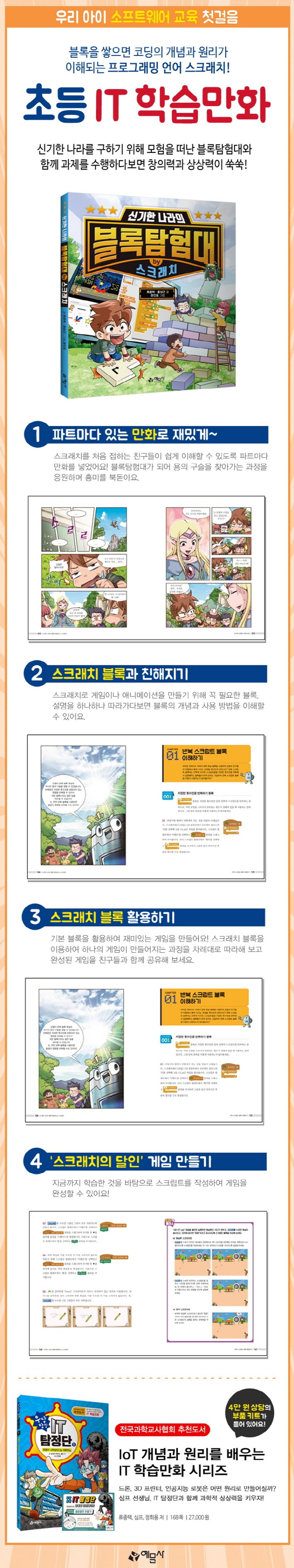 초등학교 3~6학년을 위한 스크래치 학습만화 《신기한 나라의 블록탐험대 by 스크래치》. 이 책은 신기한 나라를 구하기 위해 모험을 떠난 블록탐험대가 스크래치를 이용해 미션을 해결하는 만화로 구성했다. 스크래치를 이용한 프로그래밍 방법이 쉽고 자세하게 소개된 학습 부분에서 직접 따라하며 코딩을 해볼 수 있고, 기본 원리와 개념을 익힌 후에는 아이들이 좋아하는 간단한 게임도 직접 만들어볼 수 있도록 하였다.