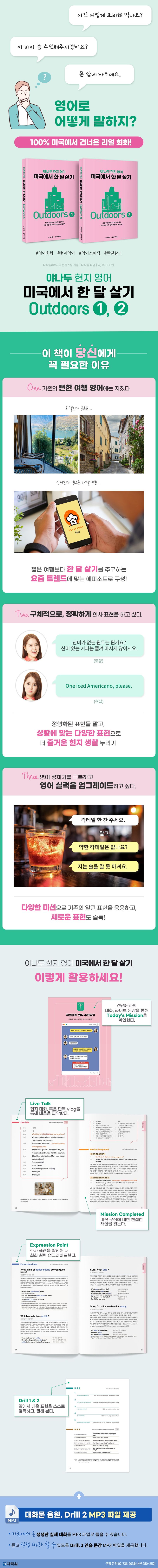 이 책은 주인공 리나가 미국 생활을 체험하면서 원어민과 나눈 대화를 수록했습니다. 파머스 마켓에 가서 물건을 구입하고, 앱으로 점심을 배달하고, 세탁소에 방문하는 등 현지에서만 일어날 수 있는 에피소드를 가지고 현지에서의 즐거움을 두 배로 만들어줄 영어를 익힐 수 있습니다.