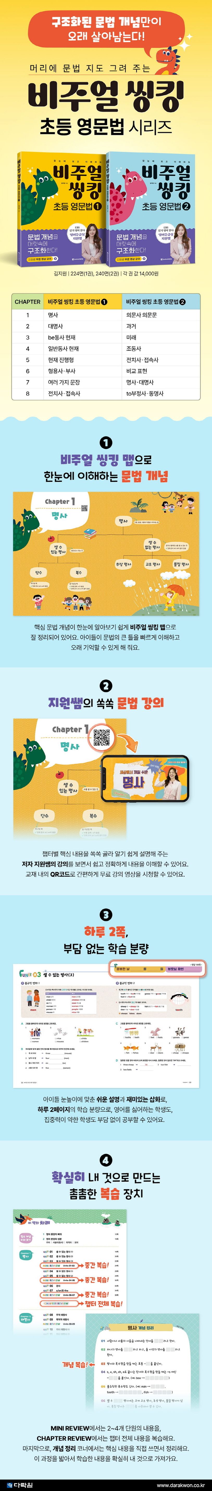 『비주얼 씽킹 초등 영문법』은 두 권으로 이루어진 초등 영문법 시리즈로, 초등학생이 쉽게 문법 개념을 익히도록 구성된 책입니다. 비주얼 씽킹 맵을 보면서 문법 개념을 한눈에 파악하고, 아이들의 눈높이에 맞게 풀어 쓴 설명을 읽으며 어려운 문법 용어를 쉽게 이해할 수 있습니다. 또한 이렇게 이해한 개념을 머릿속에 기억하도록 하는 복습 장치가 촘촘히 마련되어 있습니다. MINI REVIEW와 CHAPTER REVIEW, 그리고 마지막에 학생 스스로 내용을 쓰면서 정리하는 개념 정리 코너까지 있어, 배운 내용을 절대로 잊지 않게 합니다.