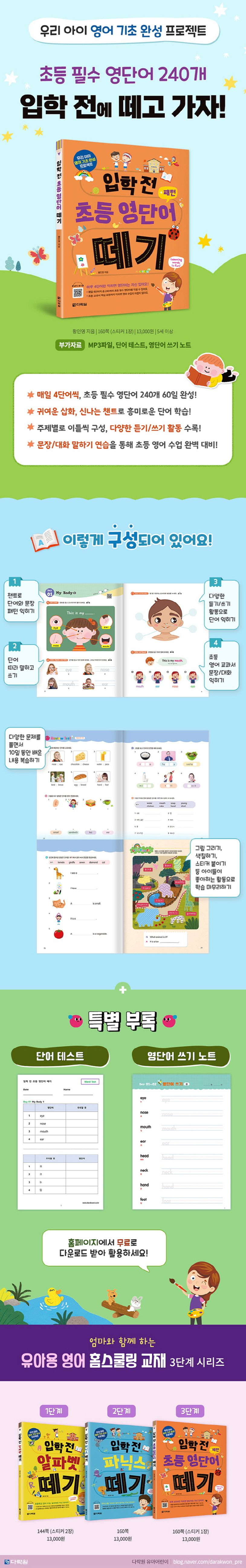 초등 영어 수업을 따라가려면 기초 영단어와 문장을 알아야 합니다. 이 책은 알파벳과 기초 파닉스를 떼고 초등학교 입학을 앞둔 아이들이 기초 영단어 240개와 필수 문장 패턴을 쉽고 재미있게 익히도록 구성했습니다. 귀여운 삽화를 보고 원어민 선생님이 부른 챈트를 신나게 따라 부르면서 단어를 즐겁게 익힐 수 있습니다. 다양하고 흥미로운 학습 활동이 가득하고, 초등 영어 교과서에 나오는 문장 패턴까지 자연스럽게 익힐 수 있어서 학교 영어 수업은 이 한 권으로 대비할 수 있습니다! 집에서 쉽게 따라 할 수 있는 홈스쿨링 교재로, QR코드만 찍으면 아이 스스로도 학습할 수 있습니다. 하루에 4단어씩 매일매일 재미있게 학습하다 보면 영어의 기초가 탄탄해지고 초등 영어 수업이 쉬워질 거예요!