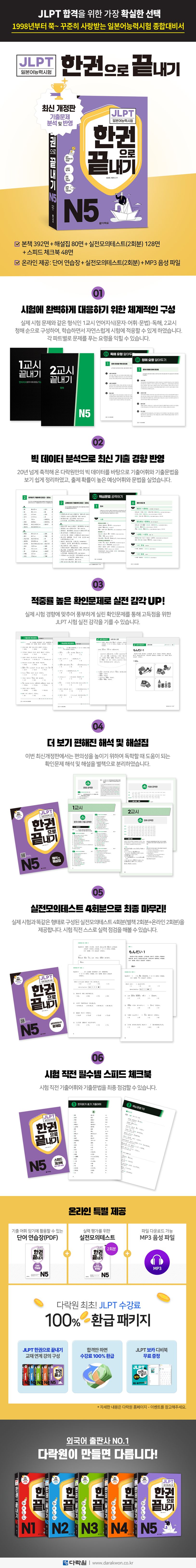 『(2022 최신 개정판) JLPT(일본어능력시험) 한권으로 끝내기 N5』는 1998년 처음 발간되어 20년 넘게 일본어 학습자들의 큰 사랑을 받고 있는 『일본어능력시험 한권으로 끝내기 시리즈』의 개정판으로, 2016년 개정된 JLPT(일본어능력시험) N5의 최신 개정판입니다.