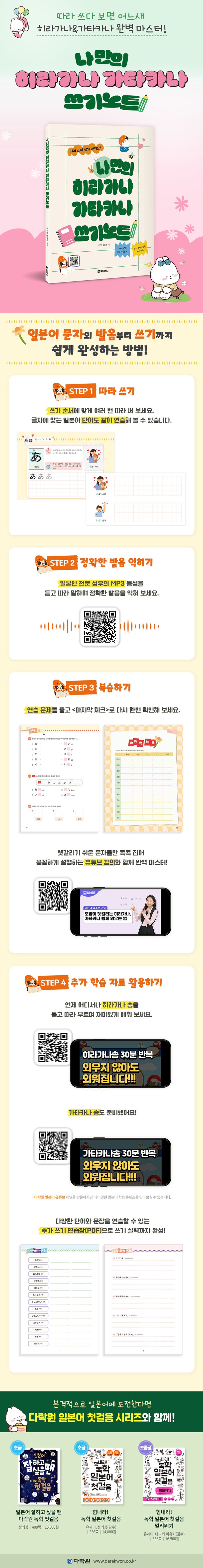 『나만의 히라가나 가타카나 쓰기노트』는 일본어를 처음 접하는 학습자가 일본어 문자 히라가나와 가타카나를 직접 쓰면서 자연스럽게 익힐 수 있는 교재입니다. 히라가나와 가타카나의 올바른 발음과 획순을 익혀 문자를 완벽히 읽고 쓰는 것을 목표로 하고 있습니다. 쉽게 글자를 쓸 수 있도록 획순에 따른 올바른 쓰기 방법도 'TIP'을 통해 알려 드립니다. 또한 각 글자와 관련된 다양한 일본어 단어도 같이 익히고 단어 쓰기 연습도 해 볼 수 있으며, 연습 문제를 통해 배운 내용을 다시 한번 확인하고 자신의 실력을 점검할 수 있습니다. 추가 쓰기 연습장 PDF를 통해 더 많은 일본어 단어와 문장을 써 보며 일본어 문자를 완벽히 마스터할 수 있습니다.