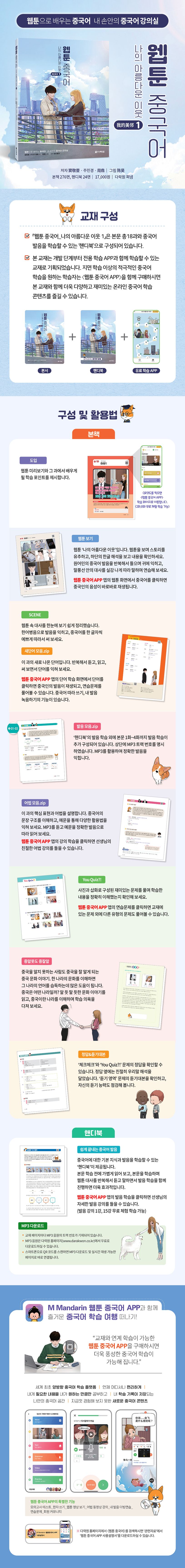 『웹툰 중국어_나의 아름다운 이웃 1』은 중국어 발음 학습을 도와주는 핸디북과 본문 총 18과로 구성되어 있습니다. 기초~초급 단계에 해당하며, HSK 1~3급에 해당하는 초급 어휘 및 어법 내용을 바탕으로 설계되었습니다.