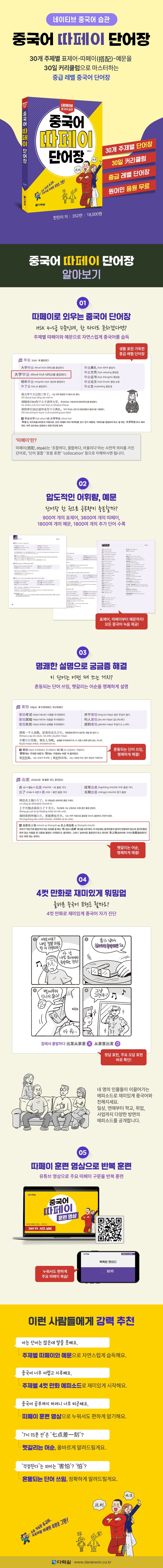 『중국어 따페이 단어장』은 30개 주제별 표제어, 따페이(搭配), 예문을 30일 커리큘럼으로 마스터하는 중급 레벨 중국어 단어장입니다. 중국어 단어를 따페이로 외우면, 단어의 의미를 이해하기 쉽고, 용법 실수도 줄어들고, 네이티브 표현을 통째로 익힐 수 있습니다. 따페이와 예문에는 재미있으면서도 친근한 일상을 담았습니다. 책 속의 모든 중국어에 원어민 녹음이 제공되며, 따페이 훈련 영상을 통해 편리하게 복습할 수 있습니다.