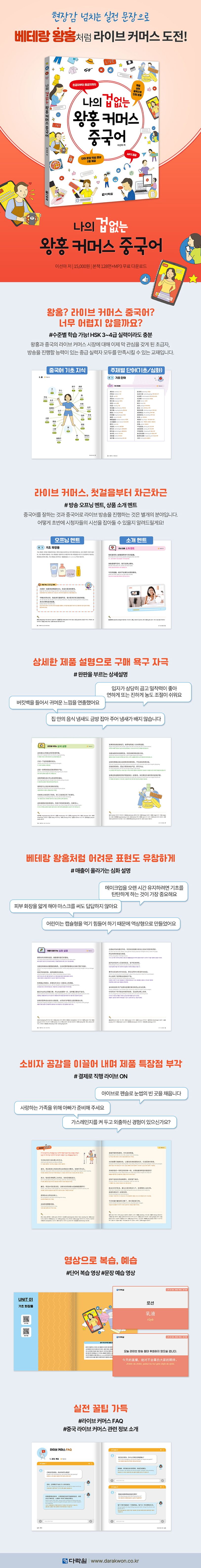 『나의 겁없는 왕홍 커머스 중국어』는 중국 현지 사람을 상대로 하는 라이브 커머스 시장에 진출하고 싶지만, 관련 용어나 표현이 낯선 초중급 수준 중국어 학습자분들을 위한 책입니다.본 교재는 크게 세 가지 PART로 나누어져 있습니다. 중국어 기초 지식을 가볍게 정리한 후, 주제별 단어를 익혀 어휘 수준을 올린 다음, 실전 라이브 커머스 표현을 익히는 단계별 학습을 구현했습니다.