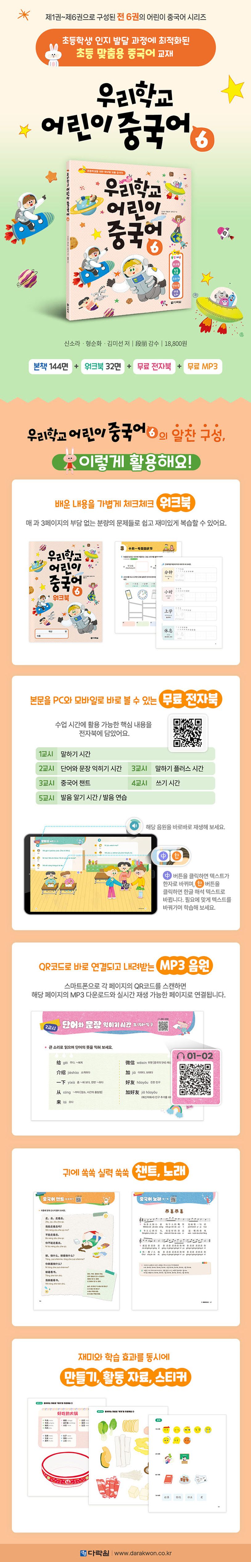 『우리학교 어린이 중국어』 시리즈는 초등학생의 인지 발달 과정을 중시하여, 그에 맞는 학습법과 학습량으로 보다 쉽게 중국과 중국어에 대한 종합적인 정보를 학습하는 것을 목표로 설계한 교재입니다. 『우리학교 어린이 중국어 6』에서는 주인공인 윤아, 위쩐, 지에하오, 한스, 민희가 베이징의 국제학교에서 즐겁게 생활하는 일상을 담고 있습니다. 주인공 친구들과 함께 즐겁게 일상 회화를 배우고, 챈트와 노래를 따라 부르며 중국어를 재미있게 배울 수 있도록 구성했습니다. 또 병음 읽기 훈련을 하고 단어를 따라 써 보며 6권에서도 꾸준히 중국어 발음을 연습할 수 있습니다.