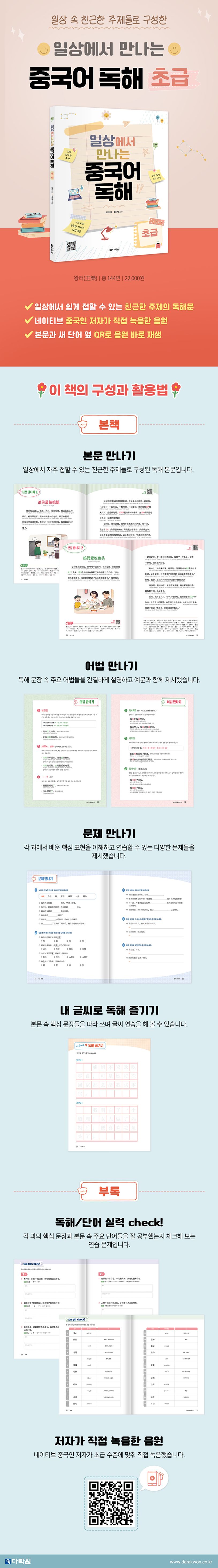 이책의구성및특징『일상에서만나는중국어독해초급』은우리가생활하면서일상에서쉽게접할수있는친근한주제들로독해문을구성하였습니다.따라서풍부한문화지식뿐만아니라,중국인들의일상이잘녹여져있어서언어를배우는동시에중국문화의매력까지느낄수있을것입니다.또한독해문장속주요어법들을예문과함께제시했고,각과에서배운핵심표현을이해하고연습할수있는다양한문제들도제공하고있습니다.각본문과새단어옆QR코드를스캔하면네이티브중국인저자가직접녹음한음원이바로재생됩니다.