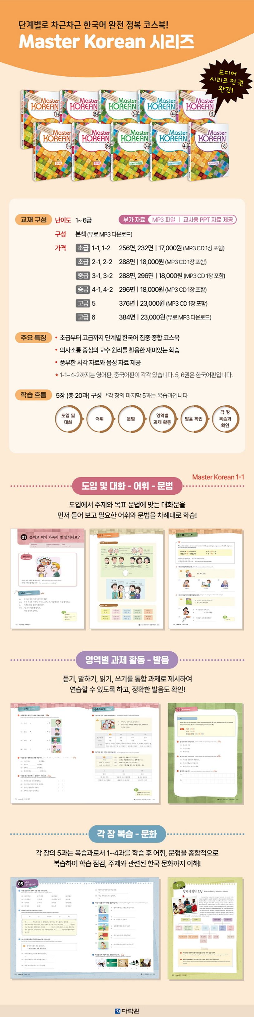 ‘Master KOREAN 3-2’은 한국어능력시험 준비생을 위해 필수 어휘와 문법으로 구성하였고, 다채로운 시각 자료와 음성 자료를 통해 듣기, 말하기, 읽기, 쓰기를 통합적으로 학습할 수 있도록 한 한국어 완전 정복서이다.