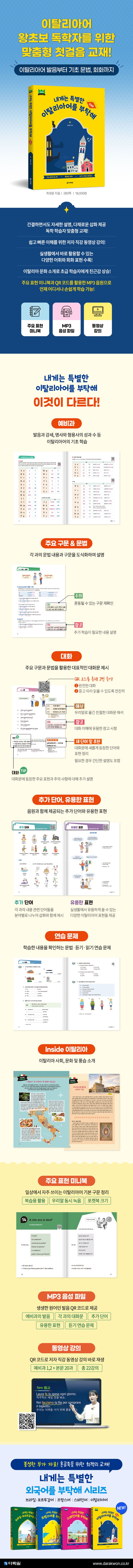 “내게는 특별한 이탈리아어를 부탁해”는 이탈리아어를 처음 배우는 학습자들이 발음에서부터 기초 문법, 나아가 회화까지 스스로 익히고 응용할 수 있도록 구성한 첫걸음 교재이다. 초보 학습자들이 어렵게 느끼는 이탈리아어의 기초 구문과 문법을 한눈에 파악할 수 있도록 체계적으로 정리함으로써 학습자들의 이해를 돕고 이를 바탕으로 현지 상황에 맞는 대화로 연출함으로써 앞서 학습한 구문과 문법을 실생활에 응용할 수 있도록 하였다. 또한 원어민의 생생한 발음이 담긴 MP3 파일과 유용한 표현을 엄선한 ‘주요 표현 미니북’을 통하여 이탈리아어에 친숙해질 수 있도록 하였다. 이탈리아어 기초 학습자가 이탈리아어의 기능을 보다 쉽게 이해할 수 있도록 저자 직강 동영상 강의를 QR 코드를 통해 제공하여 체계적이고 재미있게 이탈리아어를 학습할 수 있도록 돕는다.