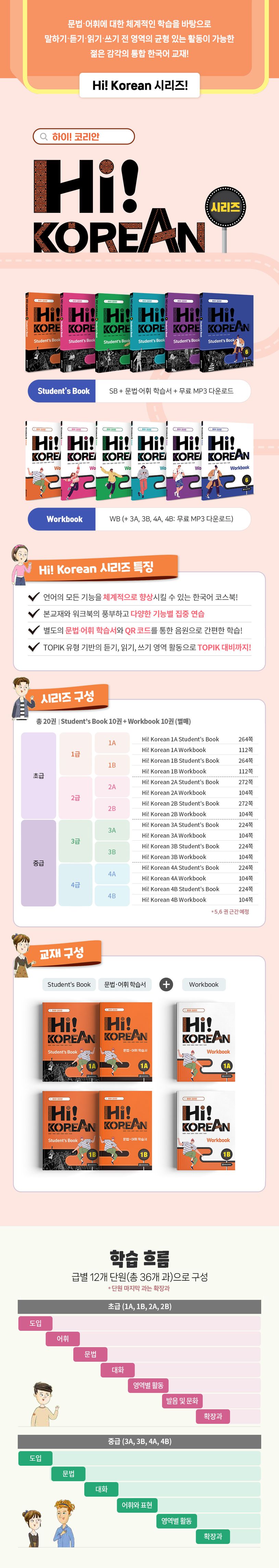 "Hi! Korean 시리즈" 의 전체적인 구성은 Student Book 전 10권(초급 4권, 중급 4권, 고급 2권), 여기에는 별책으로 '문법·어휘 학습서'가 포함되어 있으며, Workbook 전 10권(초급 4권, 중급 4권, 고급 2권)은 별도 판매로 이루어진다.