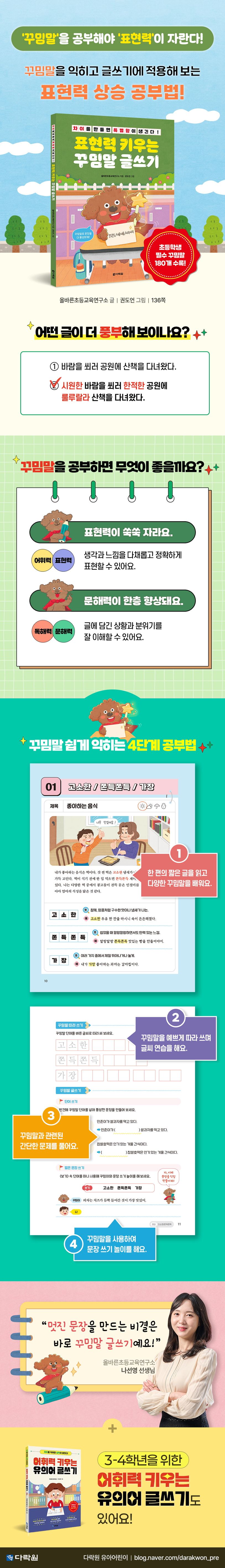 『표현력 키우는 꾸밈말 글쓰기』에는 초등 교과서와 아이들의 생활 속 표현을 분석하여 추출한 꾸밈말 180개가 들어 있어요.‘주룩주룩, 슬그머니, 짝짝, 두근두근, 후다닥’처럼 귀에 익은 꾸밈말부터 ‘포근히, 꼼꼼히, 차근차근히, 활발히’처럼 일상에서 자주 쓰이는 단어들이 가득 채워져 있답니다.