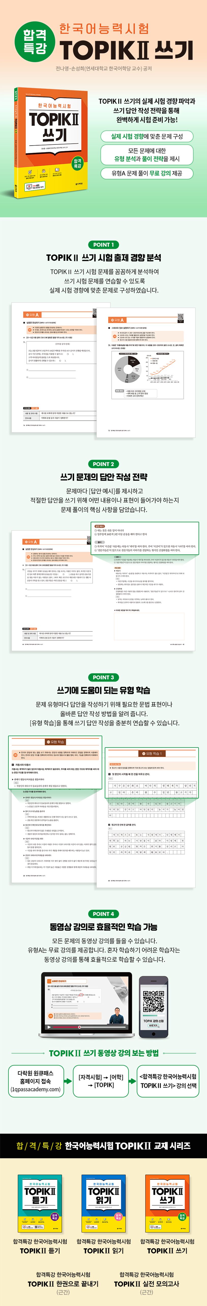 TOPIKⅡ 쓰기 시험을 준비하면서 가장 중요한 것은 실제 시험 문제의 경향에 대한 파악과 다양한 문제 풀이를 통한 답안 작성 연습이다. 이 책에서는 학습자가 쓰기 답안을 작성할 때 어떤 점에 중점을 두고 작성해야 하는지 그 학습 방법을 알려 준다. 문제 풀이 방법을 전략적으로 파악할 수 있도록 TOPIKⅡ 쓰기 시험 4문제를 각각의 유형으로 정리하고 각 문항당 2문제씩 구성하여 수록하였다. 각 유형마다 답안 작성을 위한 연습을 할 수 있도록 충분한 연습문제와 예문을 구성하였다. 또한 문제 풀이의 핵심을 짚어 주는 동영상 강의를 통해 좀 더 효율적으로 시험 대비를 할 수 있다.