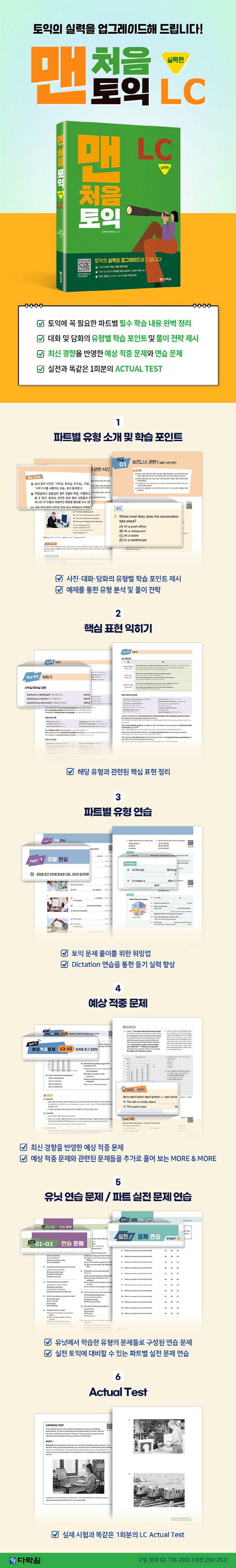 기본서 학습을 통해 토익의 기본기를 갖춘 다음에는 실제 시험에 대비할 수 있을 정도로 실력을 높여야 한다. 〈맨처음 토익 실력편〉 시리즈는 토익의 기본기를 다진 학습자들의 실력을 한 단계 업그레이드하기 위해 개발된 교재이다. 〈맨처음 토익 LC 실력편〉은 상황 및 주제별로 분류한 사진, 대화, 담화의 유형에 따라 학습할 수 있도록 구성되어 있다. 유형 공략에 필요한 내용을 학습한 다음 실제 시험에 출제될 가능성이 높은 예상 적중 문제를 풀어 봄으로써 토익에 대한 적응력을 높일 수 있다. 또한, 유닛 연습 문제, 파트 실전 연습, 그리고 1회분의 Listening Actual Test를 통해 실전에 대비할 수 있도록 하였다. 페이지에 삽입된 QR코드를 인식하여 MP3 음원을 다운로드할 필요 없이 바로 들을 수 있다.