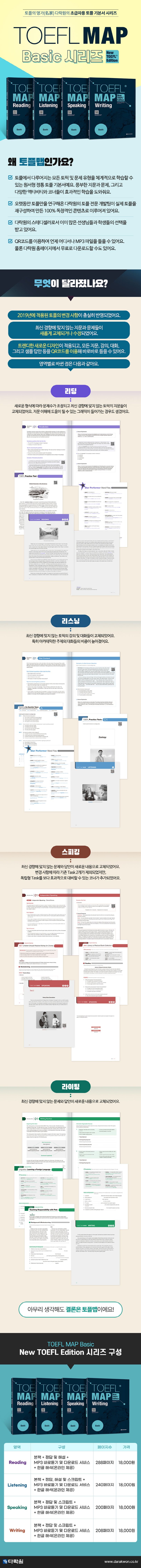 Reading, Listening, Speaking, Writing 각 영역별 3단계 총 12권로 구성된 〈TOEFL MAP (New TOEFL Edition)〉 시리즈는 2019년 8월부터 시행된 토플의 변화를 충실히 적용한 TOEFL MAP 시리즈의 개정판이다. 해당 시리즈의 Speaking 영역 학습서인 〈TOEFL MAP Speaking Basic (New TOEFL Edition)〉은 실전 토플 60점 이상을 목표로 하는 초중급 학습자를 위한 토플 학습서로서, 일반적 문제 풀이 방식에서 벗어나 문제를 다각도로 접근하는 가운데, “답변을 찾아내는 능력 강화”에 초점을 맞추고 있다. 학습자들이 “실제 시험에 보다 더 완벽하게 대비”할 수 있도록 실전 문제 2회분이 제공되며, QR코드를 통해 간편하게 MP3 파일을 무료로 이용할 수 있다. 또한 한글 해석, 단어 리스트, 추가 Sample Responses 등의 부가 자료는 다락원 홈페이지(darakwon.co.kr)를 통해 무료로 다운받을 수 있다.