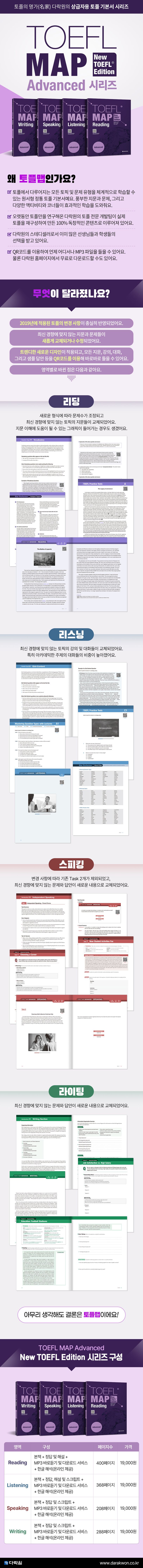 4개 영역(Reading, Listening, Speaking, Writing)의 3단계로 구성된 원서 형태의 TOEFL MAP New TOEFL Edition 시리즈의 Listening 영역 Advanced 단계 학습서이다. 문제가 포함되어 있는 본책, 모든 문제에 상세한 설명과 강의 및 대화의 스크립트가 들어 있는 정답지, 그리고 바로듣기 및 온라인 다운로드가 가능한 MP3 파일 등으로 구성되어 있다. 본 교재는 실전 토플 90점 이상을 목표로 하는 상급 학습자를 위한 학습서로서, 토플의 모든 문제 유형과 토플에서 자주 접할 수 있는 주제들을 학습자가 자연스럽게 익힐 수 있도록 기획되었다. 아울러 강의 및 대화의 이해도를 높일 수 있는 액티비티와 분야별로 정리된 핵심 어휘 코너, 그리고 실전 문제 2회분이 포함되어 있다. 모든 지문의 한글 해석은 다락원 홈페이지(www.darakwon.co.kr)에서 무료로 제공받을 수 있다.