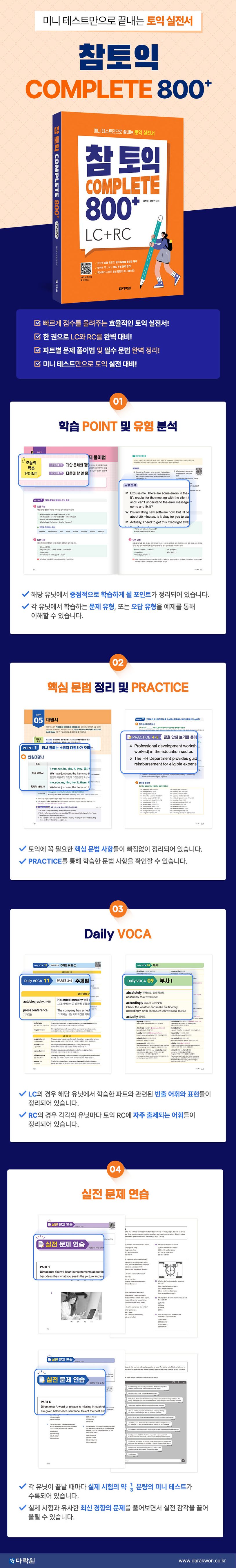 〈참토익 Complete 800+〉는 한 권으로 토익 800점 이상을 달성하는 것을 목표로 개발된 교재입니다. 많은 분량을 학습할 시간이 부족한 수험자들을 위해 파트별 문제 풀이법, 필수 문법 사항, 빈출 어휘 등 핵심적인 내용들만 정리해 두었습니다. 또한, 매 유닛마다 미니 테스트가 수록되어 있어, 단기간에 목표 점수가 필요한 학습자들이 이론과 실전을 한 권으로 완벽하게 대비할 수 있습니다.