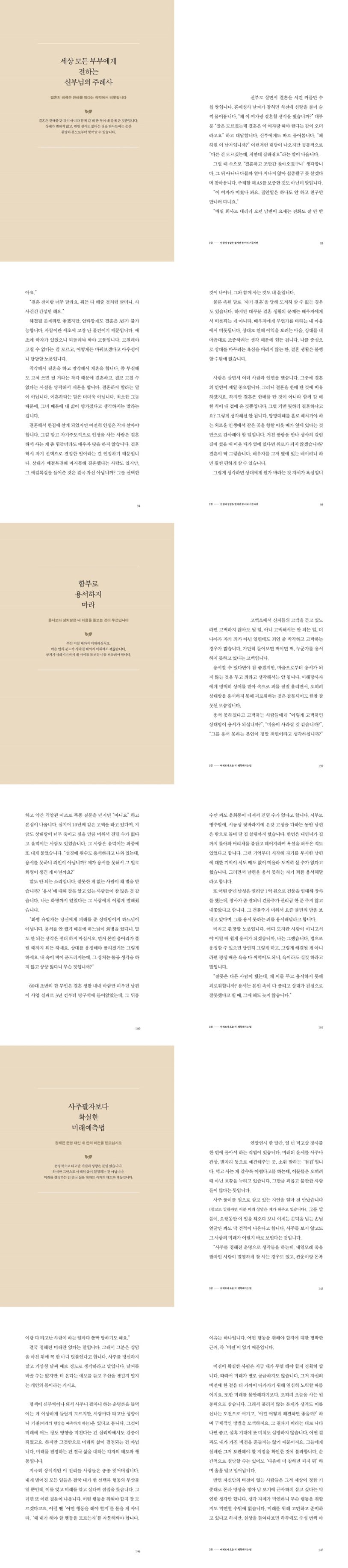 억울한 일을 당해 화가 난다면 평생 배운 욕을 모두 써도 좋으니 실컷 욕부터 하라고 하고, 가족 때문에 희생하는게 힘들다는 사람에겐 남 돌볼 시간에 내 몸부터 챙기라고 조언한다. 그가 이렇게 현실적인 조언을 거침없이 날릴 수 있는 이유는 성직자이면서도 누구 못지않게 속세 한 가운데 살고 있기 때문일 것이다.