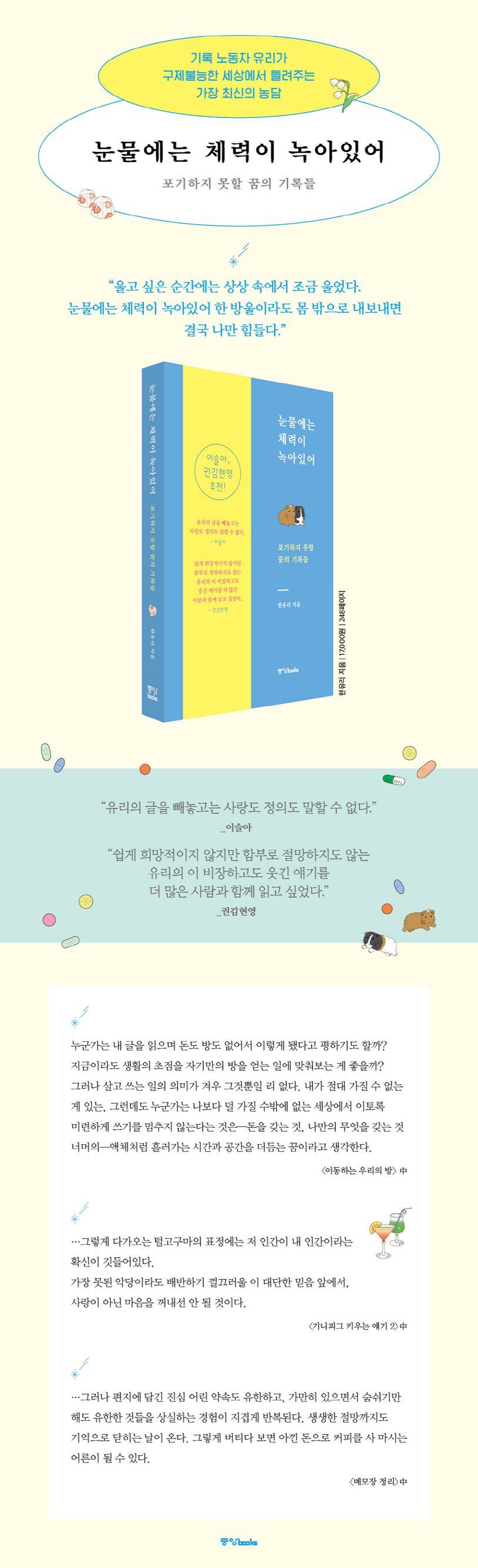 불안하지만 다룰 수 있는 세계가 주는 안도감 안에서 긍정의 말이 아닐지라도 진지한 유머를 잃지 않는, 아주 최신의 농담의 말들이 실려 있는 《눈물에는 체력이 녹아있어》는 유리의 기나긴 기록 노동 여정의 첫 이정표다.