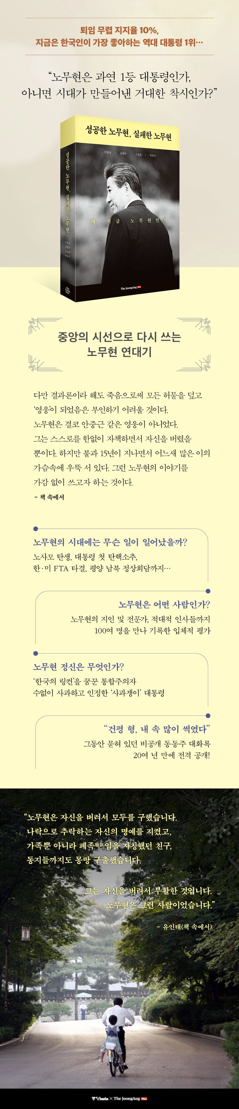 이제 지난 1년여간의 복원 작업 결과를 다시 단행본으로 엮어 세상에 올린다. 아마도 노무현은 더 오랫동안 한국인이 가장 좋아하는 대통령으로 남아 있을 가능성이 크다. 『성공한 노무현, 실패한 노무현』은 독자들의 판단을 구한다. 노무현은 과연 1등 대통령인가. 아니면 시대가 만들어낸 거대한 착시인가.