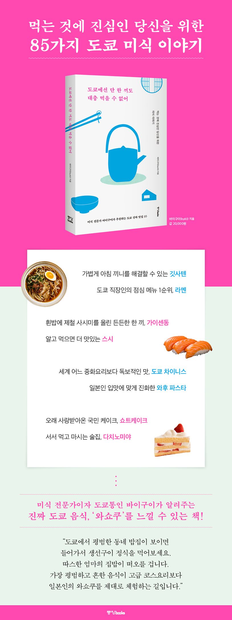 먹는 것에 진심인 사람들을 위한 도쿄 미식 이야기 《도쿄에선 단 한 끼도 대충 먹을 수 없어》가 출간됐다. 도쿄에서 유년기를 보낸 저자 바이구이는 도쿄 음식의 진가를 고급 요리가 아닌 가장 평범한 도쿄 사람들이 먹는 한 끼, ‘도쿄식 와쇼쿠’에서 찾는다. 가볍게 아침 끼니를 해결할 수 있는 ‘깃사텐 모닝세트’, 도쿄 직장인의 점심 메뉴 1순위 ‘라멘’, 흰밥에 제철 사시미를 올린 ‘가이센동’, 세계 어느 중화요리보다 독보적인 맛을 자랑하는 ‘도쿄 차이니스’, 일본인 입맛에 맞게 진화한 ‘와후 파스타’, 일본의 국민 케이크 ‘쇼트케이크’ 등 도쿄식 와쇼쿠를 충분히 경험해 볼 수 있는 85곳의 맛집 정보를 소개한다.