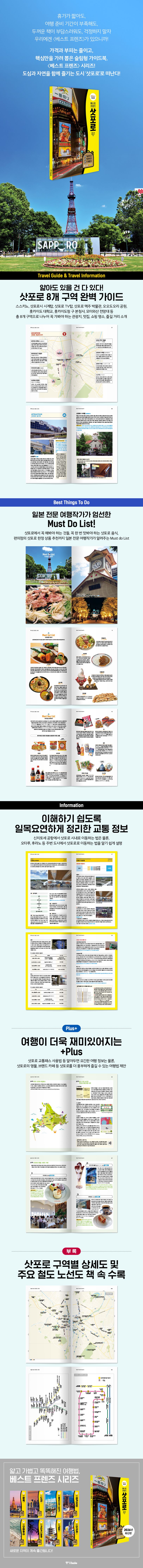 〈베스트 프렌즈 삿포로〉는 삿포로의 도심과 근교 여행을 모두 아우르는 콤팩트 가이드북이다. 150쪽 내외의 가벼운 분량에 최신 현지 정보를 꼼꼼하게 담아, 여행 직전에도 부담 없이 펼칠 수 있다. 삿포로의 핵심 명소부터 오타루·후라노·비에이 당일치기 코스까지 실속 있게 정리해, 하루만 투자해도 다채로운 삿포로 여행을 완성할 수 있도록 돕는 책이다.
