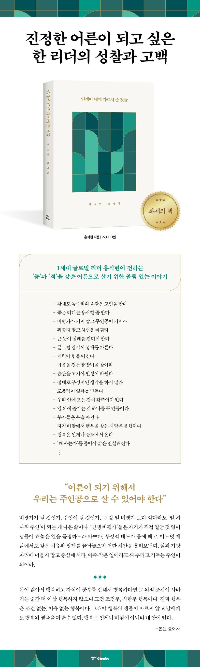 홍석현 중앙홀딩스 회장이 그동안의 삶의 여정을 뒤돌아보며 얻은 삶의 지혜를 정리한 에세이, 『인생이 내게 가르쳐 준 것들』(중앙북스)을 펴냈다. 중앙일보, JTBC 등 중앙미디어그룹을 이끌며 국내 미디어 산업의 발전과 개혁을 이끌어온 그는 해방 후 대한민국 국적으로 태어나 해외 유학에 오른 1세대 글로벌 리더이기도 하다. 거창한 담론이 아닌 구체적인 삶의 체험에서 길어낸 진솔한 고백과 성찰을 통해 독자들에게 지혜, 리더십, 영성을 전하는 책이다. 한국 사회의 격변기 속에서 1세대 글로벌리스트로서 쌓아온 경험과 세계적 지도자들과의 교류 등 독창적이며 흥미로운 서사가 가득 담겼다.