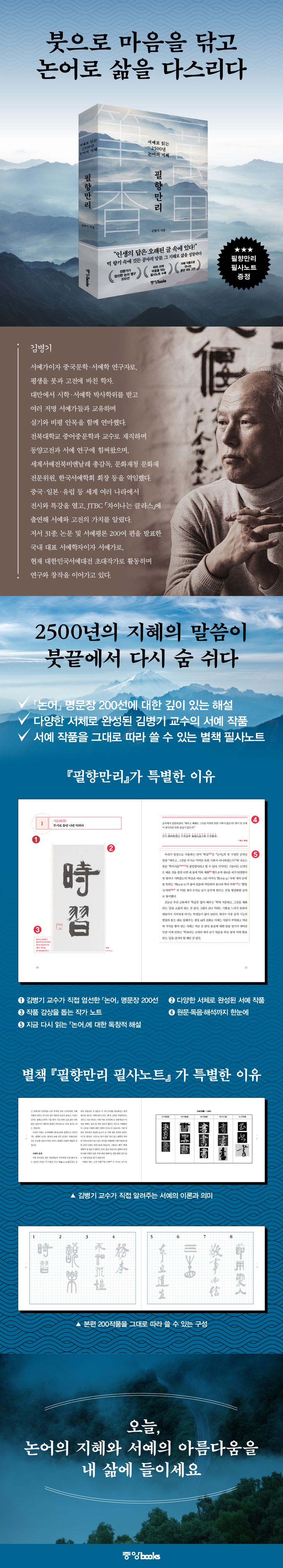 곁들여‘필향만리’라는표제를붙인이유가여기에있다.『논어』를단순히읽는데그치지않고『논어』속의명언을필향을통해내안에스미게하고자한것이다.스민다는것은체화(體化)를의미한다.체화는곧실천이다.붓을들고서예작품으로쓰면더할나위없이좋겠지만꼭붓이아니더라도붓펜이나사인펜으로써도체화의효과는있다._프롤로그중에서
