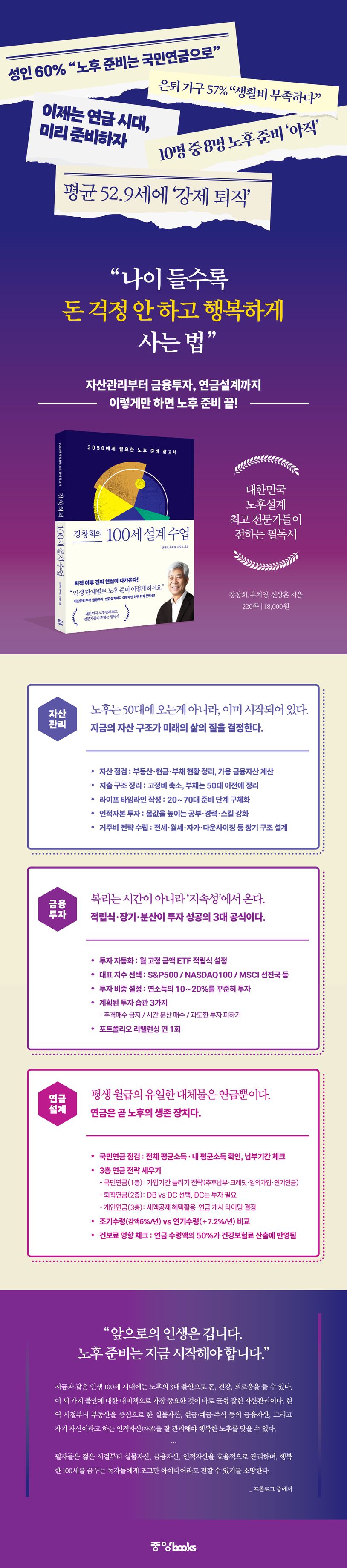 『강창희의 100세 설계 수업은』은 대한민국 노후설계 최고 전문가 3인이 자산 구조조정부터 금융투자, 연금설계, 평생현역의 삶까지 세대별로 꼭 알아야 할 구체적인 행동지침을 단계별로 제시하는 책이다. 퇴직 예정자뿐 아니라 20~30 사회초년생들에게도 막막한 노후를 준비할 수 있는 가장 현실적이고 든든한 인생 제2막 설계서가 되어줄 것이다.