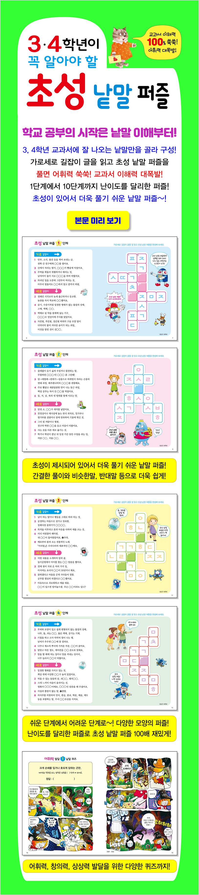 가로, 세로 길잡이 글은 3, 4학년 어린이들의 눈높이에 맞춰 쉽게 풀었으며 풍부한 예문과 비슷한말, 반대말 등을 넣어 막힘없이 술술 초성 낱말 퍼즐을 풀 수 있도록 했습니다.