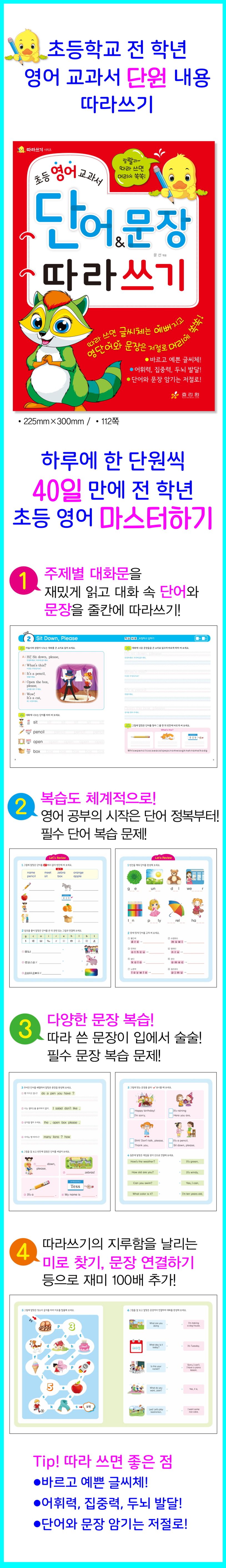 영어 교과서 내용을 기본으로 하였으므로 학교에서 배운 내용을 복습하거나 한 발 앞서 예습하는 데 안성맞춤입니다. 총 40단원으로 하루에 한 단원씩 40일이면 초등학교 전 학년 영어 교과서의 주요 단원 내용을 마스터할 수 있습니다. 단원을 마칠 때마다 ‘단어&문장 따라쓰기 습관 달력’에 스스로 체크하면서 영어에 대한 자신감과 성취감도 기를 수 있습니다.