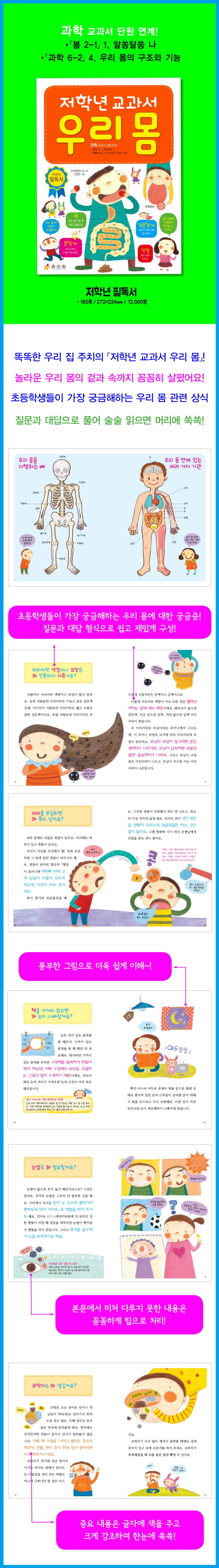 「저학년 교과서 우리 몸」은 이렇게 놀라운 우리 몸의 여러 기관과 구조, 기능에 대한 궁금증을 쉽게 풀어 쓴 책이에요. 더구나 모든 질문에 대해 그림을 곁들여 쉽고 재밌게 우리 몸에 대한 지식을 쌓을 수 있답니다.
