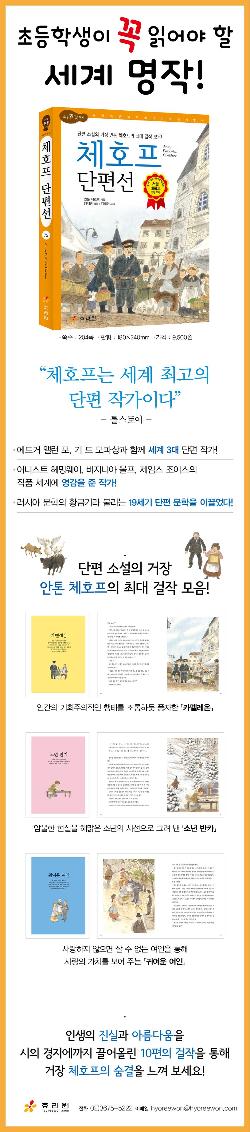 효리원의 세계 명작 『체호프의 단편선』은 인간의 기회주의적인 행태를 조롱하듯 풍자한 「카멜레온」, 당시 농가의 암울한 현실을 소년의 해맑은 시선으로 그려 낸 「소년 반가」, 사랑하지 않으면 살 수 없는 여인을 통해 사랑의 가치를 보여 주는 「귀여운 여인」 등 빼어난 심리 묘사와 빛나는 재치와 유머가 담긴 10편의 작품을 실었습니다. 인생의 진실과 아름다움을 시의 경지에까지 끌어올린 수작들을 통해 거장의 숨결을 느껴 보세요.