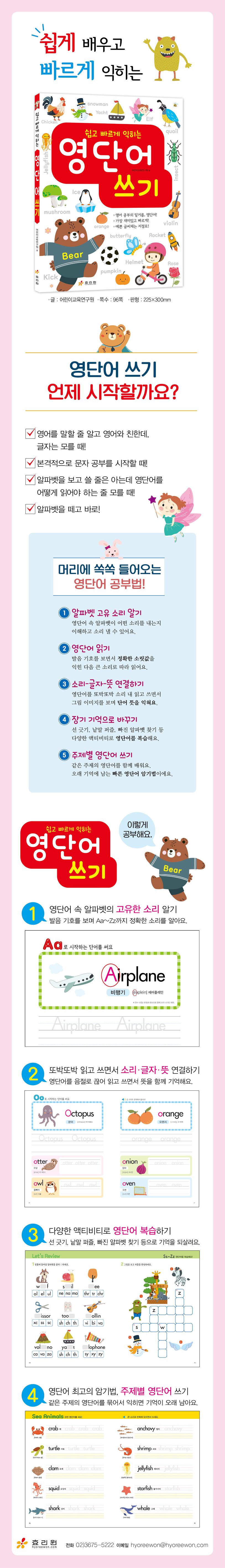 공부의 바탕은 낱말의 뜻을 정확히 알고 제대로 쓸 줄 아는 ‘어휘력’이에요. 영어 공부 역시 영단어가 실력의 밑거름이 됩니다. 알파벳 Aa는 이름이 ‘에이’지만 [애]나 [아], [에] 같은 소릿값을 가지듯, 영단어는 알파벳이 조합하여 만들어 내는 소릿값을 정확히 아는 것부터 시작해야 합니다. 《쉽고 빠르게 익히는 영단어 쓰기》는 영단어가 정확히 어떤 소릿값을 갖는지 알고서, 바르게 읽고 쓰면서 그 뜻을 이미지로 인식하도록 훈련하는 기초 영단어 책입니다.