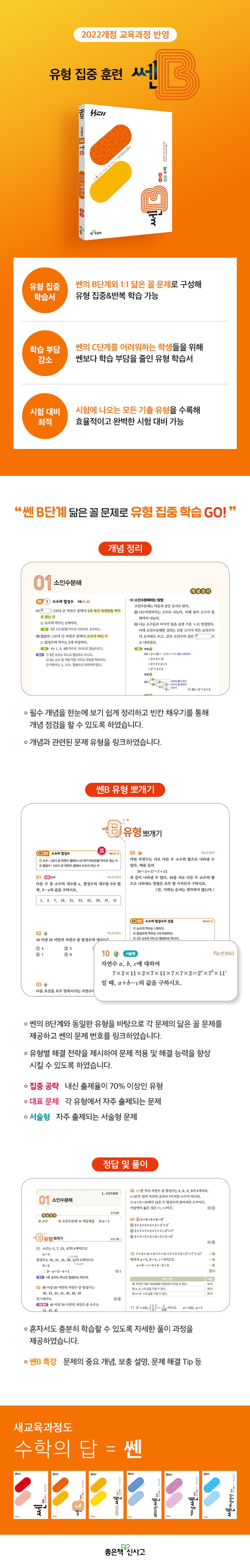쎈의B단계만공부하고싶다면?쎈의C단계가너무어렵다면?쎈을풀었는데유형만다시풀고싶다면?유형을빠르게점검하고싶다면?정답은'쎈B'입니다.쎈B는쎈의B단계와닮은꼴문제로구성되어있어쎈과함께사용시유형반복학습이가능합니다.쎈B로이미아는유형은더욱탄탄하게다지고취약한유형은보완하여모든유형을완벽히마스터해보세요!효율적이고완벽한유형학습을위한쎈B!