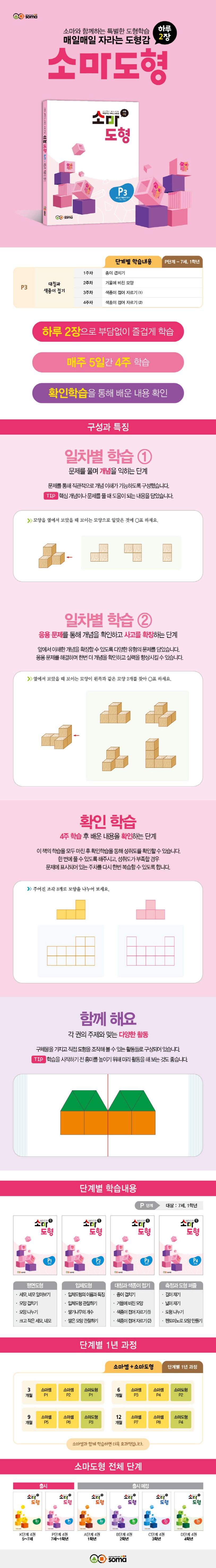 소마도형은 5세부터 초등 5학년까지의 학생들을 대상으로 초등 전과정의 도형 파트를 다루는 도형 학습서입니다.