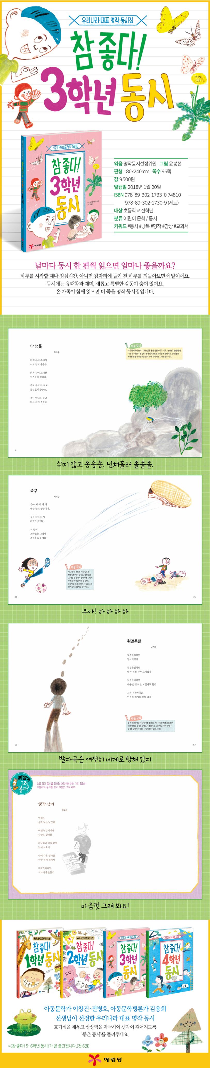 《참 좋다! 3학년 동시》는 우리나라 많은 명작 동시 중 3학년이 읽으면 좋을 작품을 담았습니다. 동시가 어렵거나 심심하다고 느꼈던 어린이들도 쉽고 재미있게 읽을 수 있도록 눈높이에 맞췄습니다. 작품 선정은 아동문학가 이창건, 전병호, 아동문학 평론가 김용희 선생님이 맡았습니다. 우리나라에서 처음으로 동시가 만들어진 1908년부터 2010년까지 등단한 시인의 작품 45편을 모아 한 권으로 엮은 동시집입니다.
