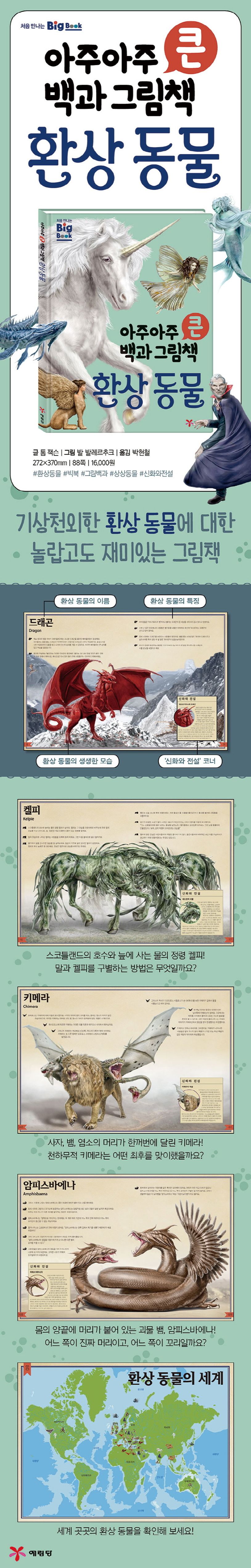 《아주아주 큰 백과 그림책 환상 동물》은 고대부터 전해 내려오는 신화와 전설 속 환상 동물을 총집합한 그림책이에요. 가장 많이 알려져 있는 인어, 드래곤, 유니콘 말고도 암무트, 바실리스크, 키메라 등 전 세계의 신화와 전설 속 환상 동물이 커다란 세밀화로 등장해요. 털 한 올까지 재현해 낸 그림은 마치 환상 속 동물을 실제로 보는 것처럼 사실적이지요. 사람의 피를 빨아먹는 뱀파이어는 어떻게 물리칠 수 있을까요? 암무트는 왜 저승 세계를 지키고 있을까요? 트롤은 왜 밤에만 돌아다닐까요? 이 책에는 기상 천외하게 생긴 36종의 환상 동물에 대한 놀랍고도 신기한 정보들이 가득 담겨 있어요. 환상 동물과 떼려야 뗄 수 없는 재미있는 '신화와 전설' 코너는 이야기의 깊이를 더해 준답니다.