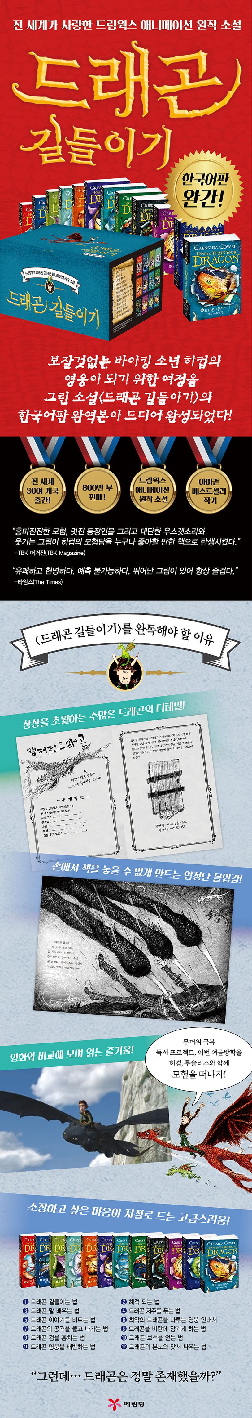 애니메이션 〈드래곤 길들이기〉는 1편이 개봉하자마자 북미 박스오피스 1위를 할 정도로 많은 사랑을 받았다. 원작 소설 〈드래곤 길들이기〉 시리즈는 영국을 시작으로 전 세계 30여 개국에서 출간, 800만 부 판매를 달성한 크레시다 코웰의 작품이다.
