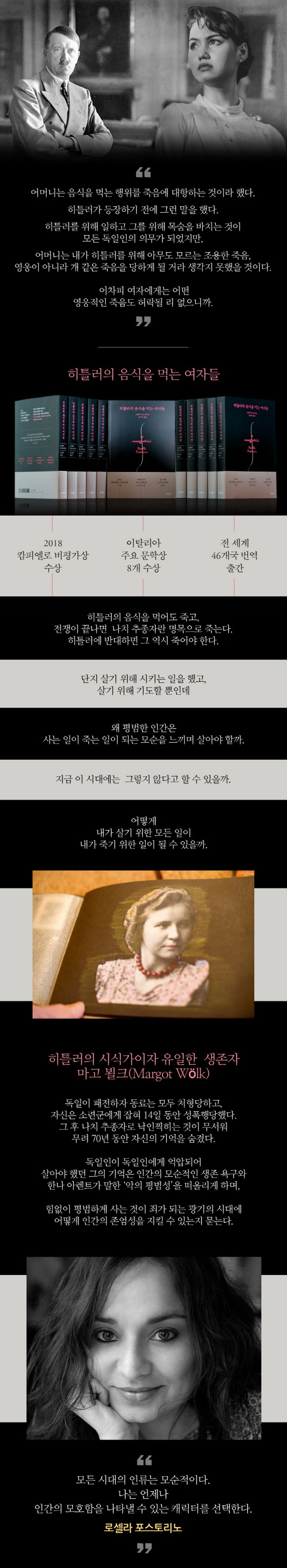 로셀라 포스토리노의 장편소설 『히틀러의 음식을 먹는 여자들』. 한국에 처음 소개되는 로셀라 포스토리노의 소설로, 실제 히틀러의 시식가이자 유일한 생존자였던 실존인물 마고 뵐크의 고백을 바탕으로 2차 세계대전 당시 히틀러의 음식에 독이 들었는지를 감별하기 위해 끌려간 여자들에 관한 이야기를 담고 있다. 평범한 인간인 로자가 스스로 악을 행하는 자와 악의 없이 악한 임무를 수행하는 인간의 틈바구니에서 생존해 나가는 과정을 그리고 있다.