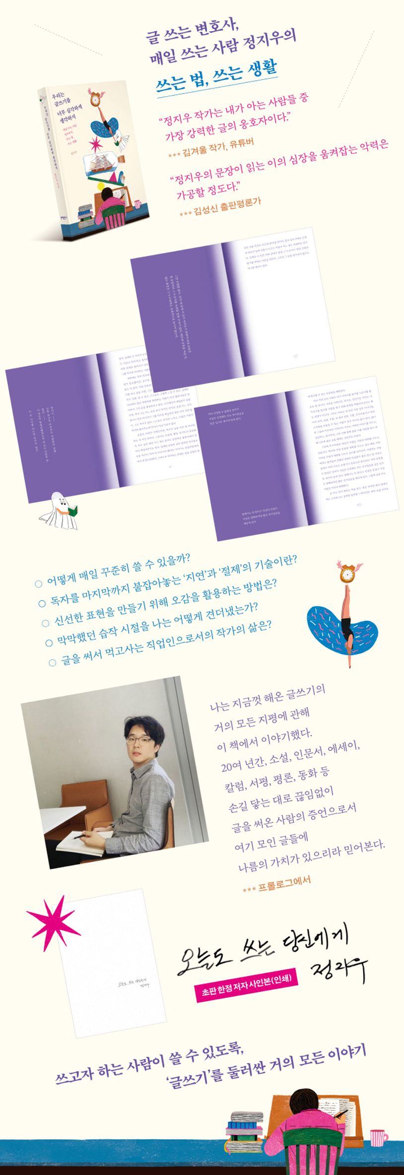 무엇보다작가는실제로매일글을쓰면서깨닫게된‘글쓰기의힘’을자신의삶을통해생생히증언하며,이미지와영상이대세가된시대에글쓰기에대한단단한믿음을잃지않는다.자신의생각을고작한문단쓰는일을어려워했던날들,하루방문객이한두명밖에되지않는블로그에글을끼적이던시절을지나,어느순간한편의글을,한권의책을쓸줄아는사람으로변모해갔다.이제그는다수의책을내고글을가르치며,글을매개로전에닿을수없었던다양한사람들과‘연결’되어위로와에너지를주고받는경험을한다.물론소속없는프리랜서작가로서의삶이녹록지않기에,그자신'변호사'라는제2의정체성을가지게되었고,“결과는버텨낸시간과일치하지않았다”는진실을자신의체험을통해담담히이야기한다.