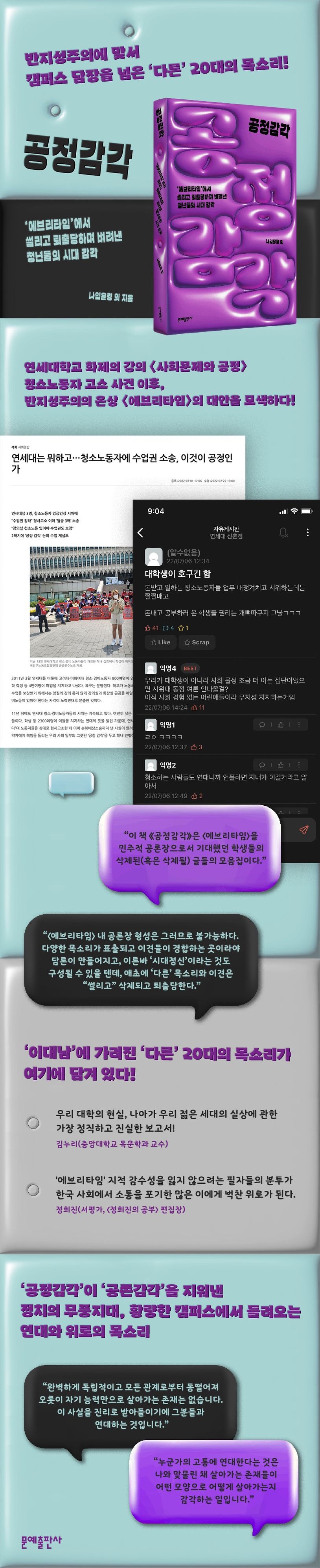 《공정감각》은 〈에브리타임〉을 민주적 공론장으로서 기대했던 학생들의 삭제된 (혹은 삭제될) 글들의 모음집이다. 학생들의 글은 전광석화의 속도로 신고되고, 삭제되었으며, 해당 글 작성자는 일정 기간 플랫폼 접속을 거부당하기도 했다. 이 책은 좀 다르고, 다양한 청년들의 글을 통해 지금의 ‘공정감각’이 실은 ‘공존감각’을 지워내고 있는 것은 아닌지 세대와 성별을 넘어 동시대를 살아가는 모든 구성원에게 질문을 던진다. 무엇보다 삭제된 글들의 복원을 통해 삭제되지 않고 남아 활개 치는 혐오 발언들이 지금 20대의 생각을 대표할 수 없음을, 20대가 ‘다른’ ‘다양한’ 사유의 주체라는 진실을 보여준다.