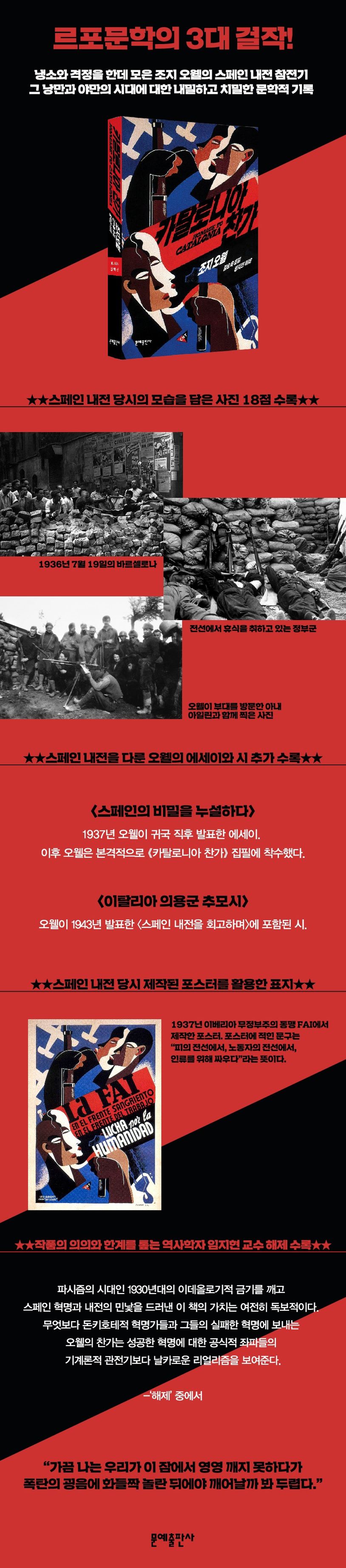 조지 오웰의 《카탈로니아 찬가》는 《중국의 붉은 별》, 《세계를 뒤흔든 열흘》과 함께 르포문학의 3대 걸작으로 꼽힌다. 1936년 발발한 스페인 내전에 참전한 조지 오웰은 《카탈로니아 찬가》에서 스페인에서 보고 느낀 것을 문학적 필치로 그려냈다. 《카탈로니아 찬가》는 스페인 내전을 어떻게 이해할 것인지와 더불어 《동물농장》, 《1984》 등 오웰의 후기 작품에 강하게 깃들어 있는 정치적 지향을 이해하는 데도 필수적인 작품이다.