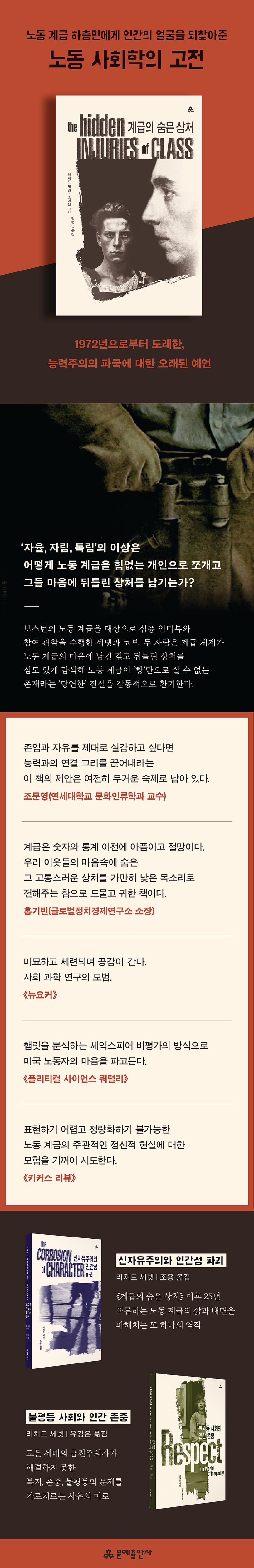 2023년,영미권의진보좌파담론을선도해온영국의버소출판사에서《계급의숨은상처》가재출간되었다.리처드세넷이청년시절에동료조너선코브와함께1972년에쓴책이었다.2023년에새롭게출간된이책의서문에서세넷은그당시‘최악의병폐’가오늘날더욱심각하게전개되고있다는데충격을받았다고적는다.책을쓸당시에는계급체계와능력주의가노동자들의마음에남기는상처가‘사회적지위’의문제였으나지금은‘생존’의문제가되어버렸다는것이다.세월이흘러세넷은여든이넘는노학자가되었다.그는“계급전사로서나의시대는끝났다”고말한다.그러나포기하거나좌절하지는않는다.“계급의식이더욱투철한사회”가도래하기를희망한다.그희망은계급의숨은상처가어디에서시작되었는지를되짚어보는데서출발해야한다.