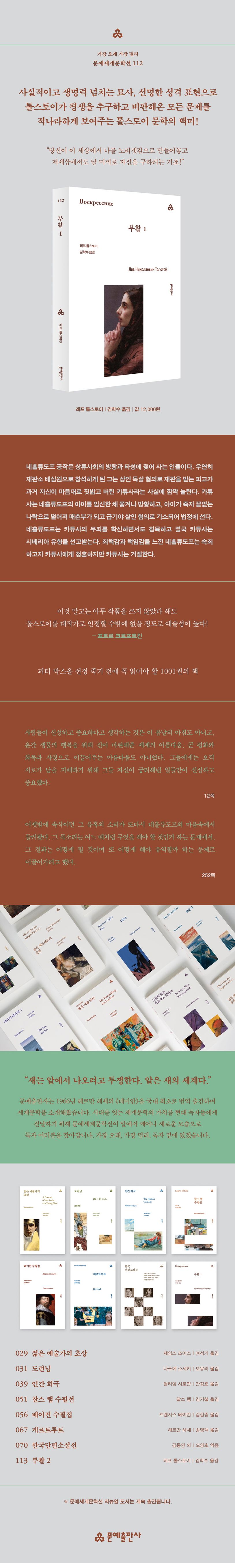 《부활》은 사실주의 작가로서 톨스토이가 역량을 유감없이 발휘한 작품으로, 러시아 사회의 모든 계층을 여러 각도에서 관찰하며 암울하고 기만적인 19세기 러시아 사회를 고발한다. 문예출판사의 《부활》은 러시아어 번역 1세대 번역자인 김학수 선생님의 번역본으로, 우리말의 멋을 살린 유려하고 자연스러운 번역으로 톨스토이와 러시아 문학의 깊이와 진수를 느낄 수 있다.
