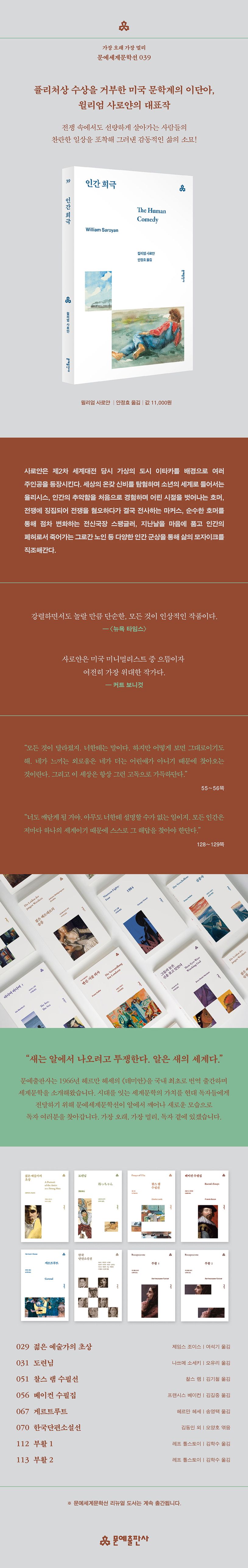《인간 희극》은 1943년 발표되었고, 같은 해에 클라렌스 브라운 감독의 영화로 제작되어 지금까지도 고전 영화로 손꼽히는 작품으로 남았다. 훗날 사로얀은 이 작품을 개작해 1966년에 다시 출간했는데 문예세계문학선 《인간 희극》은 1966년판을 저본으로 하여 소설가이자 번역문학의 대가 故 안정효 선생의 번역으로 출간되었다.