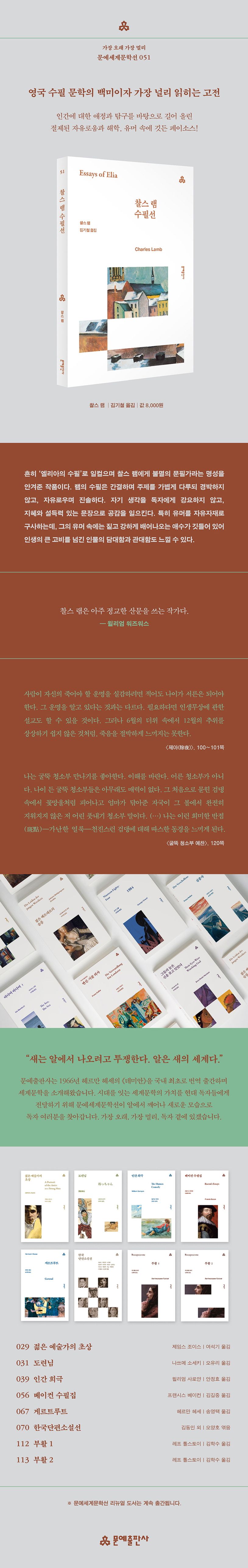 찰스 램은 정신질환을 앓던 누이 메리 램이 일으킨 끔찍한 가족의 비극을 겪은 뒤, 평생 독신으로 누이를 돌보며 살았다. 그는 S. T. 콜리지, C. 로이드 등 여러 시인과 교우하면서 시인으로 등단했고, 누이와 함께 《셰익스피어 이야기들》, 《율리시스의 모험》 등 어린이들을 위한 작품을 출간하기도 했다. 그중에서도 《찰스 램 수필선》은 그의 필명인 ‘엘리아’에서 따와 ‘엘리아의 수필’로 일컬으며 그에게 불멸의 문필가라는 명성을 안겨주었으며 세계적으로 가장 널리 읽히는 수필 문학의 고전이 되었다.
