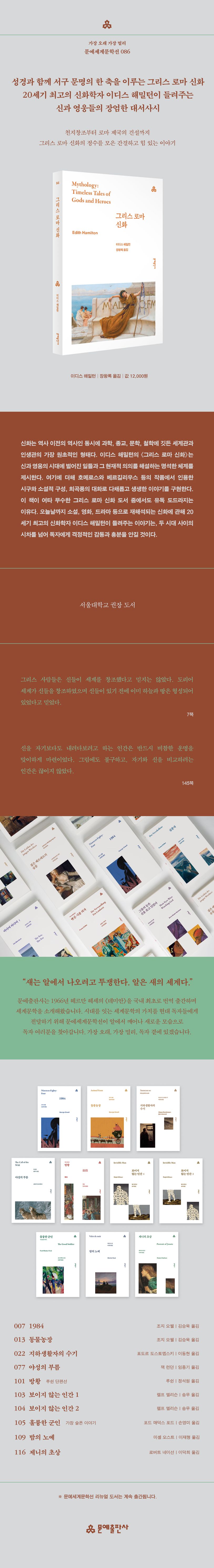 이디스 해밀턴은 이미 널리 알려진 신화 이야기를 그저 수집하여 늘어놓기만 하지 않았다. 전승되는 신화에 호메로스, 헤시오도스, 에우리피데스, 오비디우스, 베르길리우스 등이 남긴 위대한 이야기를 자기 나름의 방식으로 여과한 후 덧붙여 신화의 정수만 담은 간결하면서도 힘 있는 이야기를 만들었다. 천지창조부터 로마 제국의 건설까지, 트로이 전쟁부터 오디세우스의 모험까지, 프로메테우스부터 오르페우스까지. 자연과 역사, 신과 인간을 망라하는 무한한 이야기 중 오늘날까지 울림을 주는 이야기를 엄선해 신화를 그저 옛이야기가 아닌 지금 우리에게 필요한 이야기로 재탄생시킨 것이다. 이것이 바로 이 책이 여타 무수한 그리스 로마 신화 도서 중에서도 유독 도드라지는 이유다.